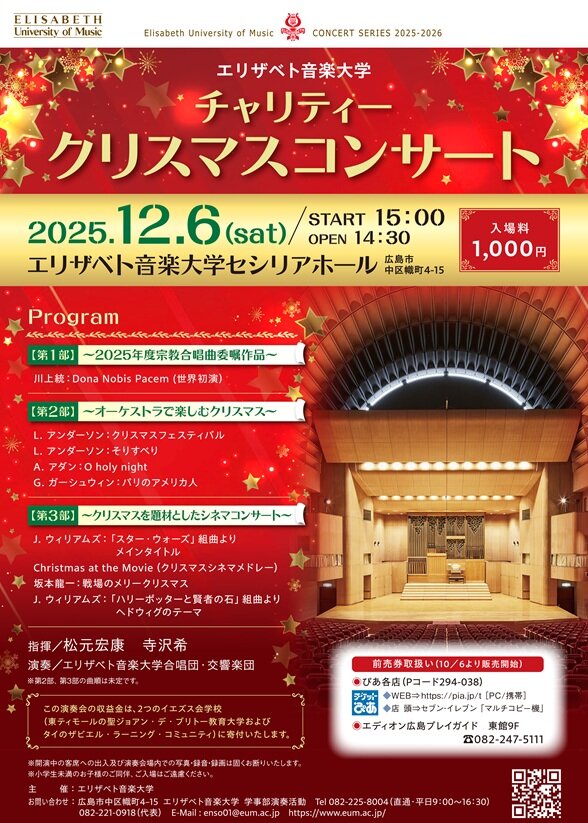 【第1部】 ■川上統:Dona Nobis Pacem(2025年度宗教合唱曲委嘱作品・世界初演) 【第2部】~オーケストラで楽しむクリスマス~ ■L. アンダーソン:クリスマスフェスティバル ■L. アンダーソン:そりすべり ■A. アダン:O holy night ■G. ガーシュウィン:パリのアメリカ人 【第3部】~クリスマスを題材としたシネマコンサート~ ■J. ウイリアムズ:「スター・ウオーズ」組曲よりメインタイトル ■Christmas at the Movie(クリスマスシネマメドレー) ■坂本龍一:戦場のメリークリスマス ■J. ウイリアムズ:「ハリーポッターと賢者の石」組曲よりヘドウィグのテーマ 指揮:松元宏康 寺沢希 演奏:エリザベト音楽大学合唱団・交響楽団 |