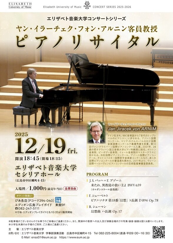 エリザベト音楽大学では12/19(金)に「ヤン・イラーチェク・フォン・アルニン客員教授ピアノリサイタル」を開催いたします。